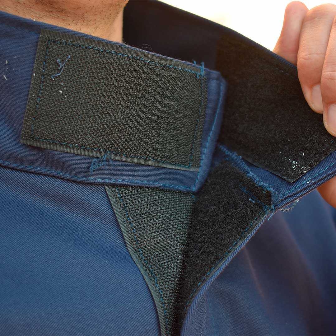 Especificações Técnicas: Blusão de segurança confeccionado em brim antichamas, costurado com linha de aramida e fechamento em velkro.